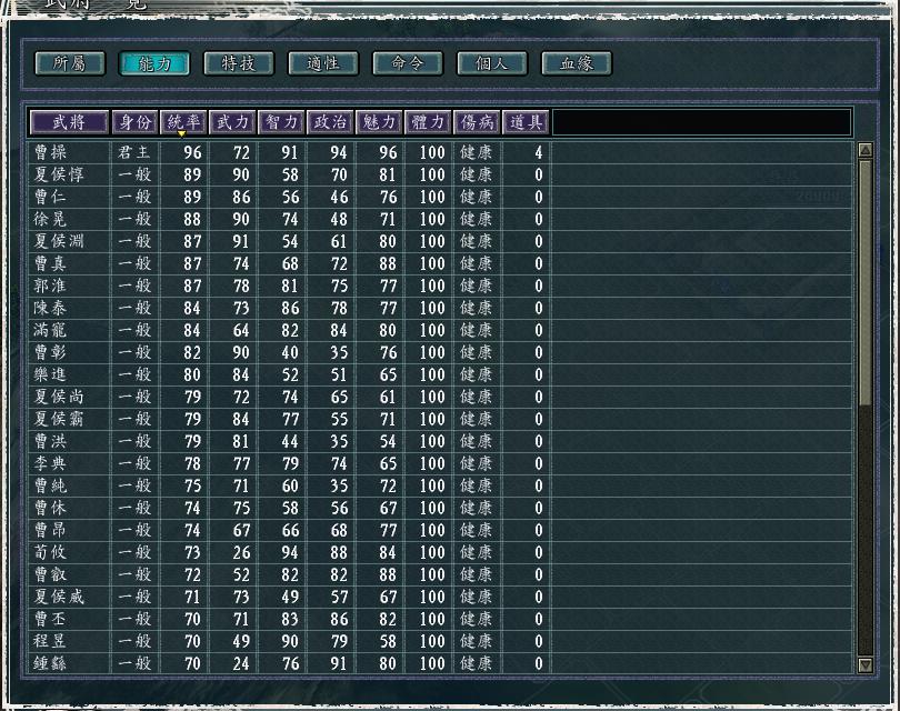 就比如上面曹操的武将列表中,夏侯渊、郭淮、曹真就都是87统率,曹丕、程昱、钟繇就都是70统率。