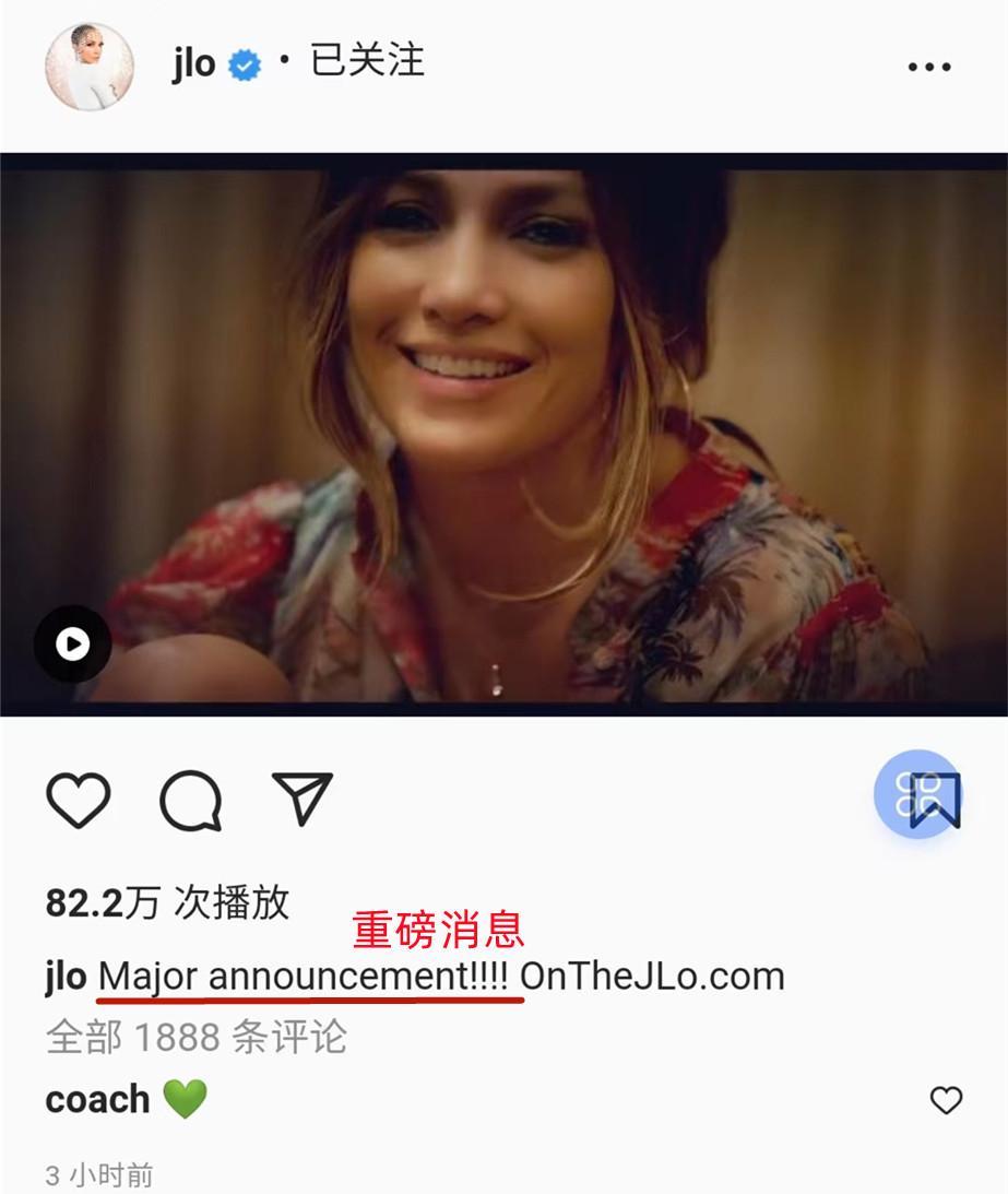 其实外媒的爆料早有预兆,在稍早些时候,詹妮弗·洛佩兹在其个人社交媒体上,就以视频的方式出现,满脸幸福地预告自己将有重磅消息宣布。