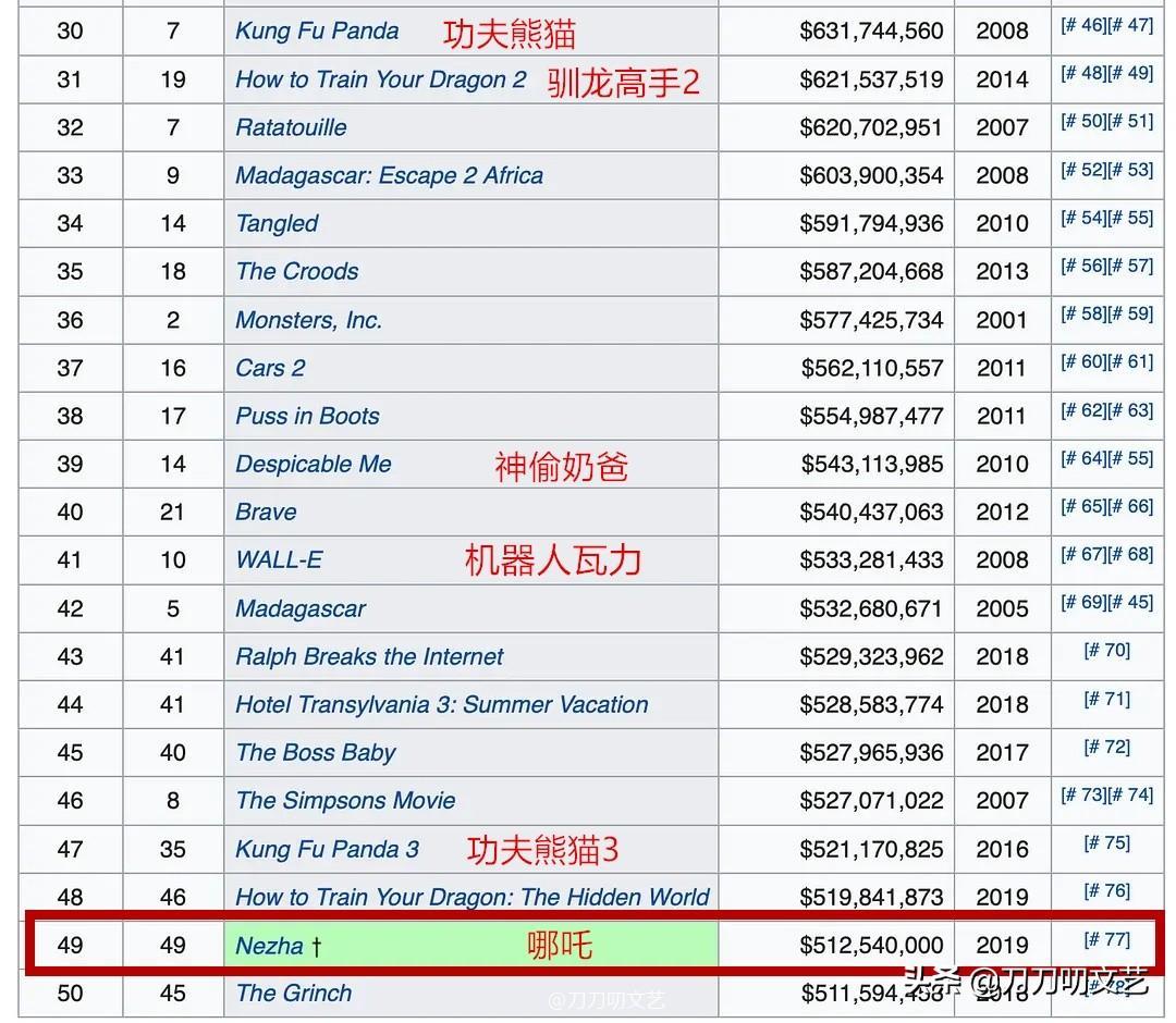 破36亿!《哪吒》进入全球动画片票房TOP50,第一名你猜不到