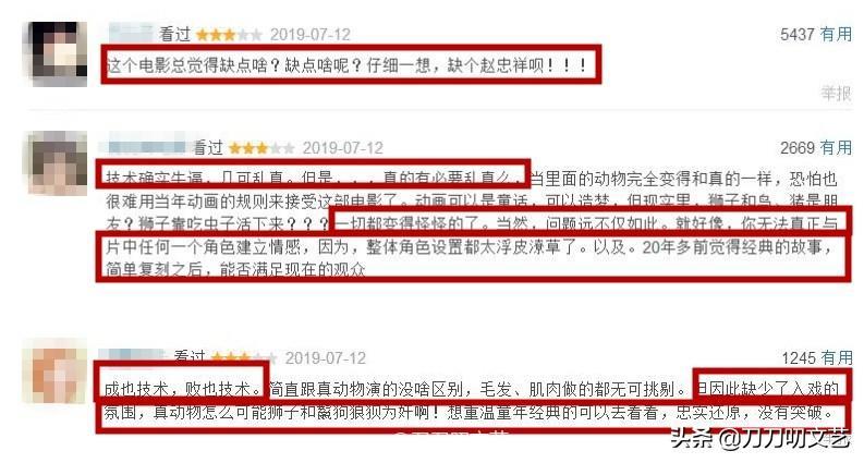 《狮子王》却是颠覆技术,精神内核却无多大改变,不少观众吐槽:“忠实还原,没有突破”、“25年前的故事简单复刻”。