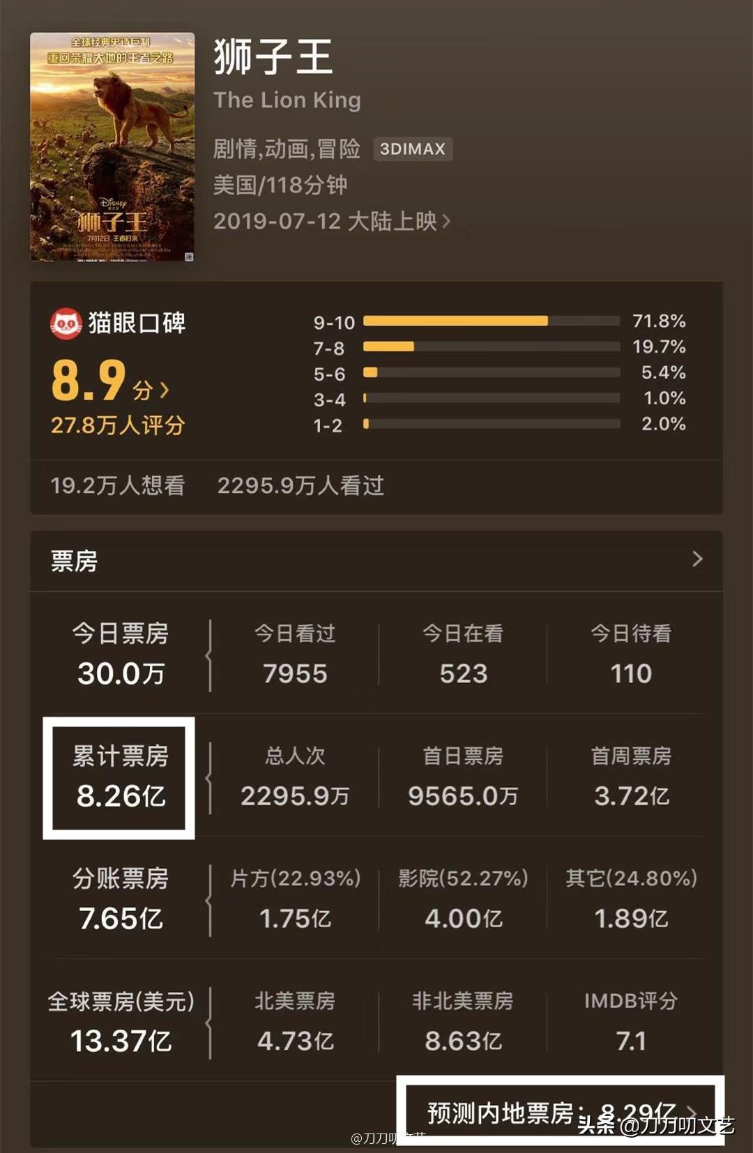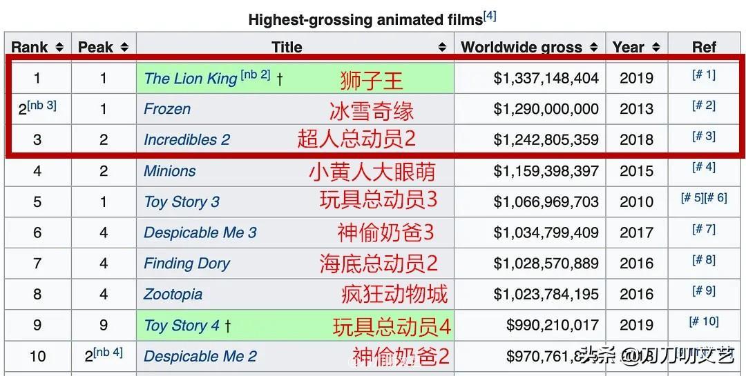 《狮子王》以13.3亿美元的票房,超越了《冰雪奇缘》(12.9亿美元),拿下榜单的全球动画票房冠军。