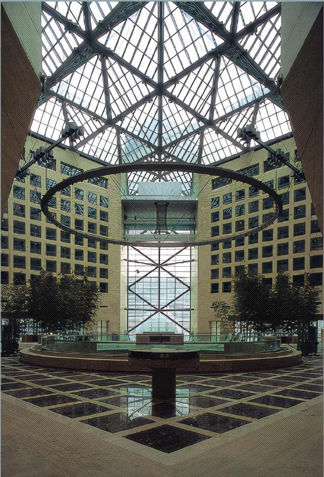 由玻璃屋顶洒下的天光,园洞形大门,不仅解决列问题更是充满了东方韵味。巨大的园林空间,通过层顶玻璃天窗和一面垂直透明的玻璃幕墙与室外联系,加之两侧玻璃大门的衬托,整个建筑显得晶莹剔透。大厅内部,西北两侧高墙上的8个巨大切面,使空间效果得到明显改善,而且还体现了银行的实力和应有的威严,不会因为中式园林的设置而显得过于秀气。切面之间悬挂着一个钢制大圆环,起到与切面缓和的作用。大厅内部墙壁有4个大圆孔,保证了西北两个方向上的视觉延伸。由东南角的主入口进去,正好与切面组成的几何构造内部空间遥相呼应。中银总部大厦的空间特点除了内部的中庭外,再就是他的入口了。