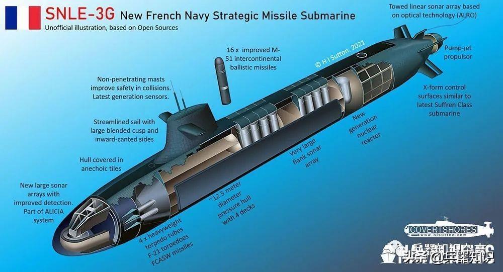 弹道导弹核潜艇 法国有4艘“凯旋”级,可以携带16枚M51潜射弹道导弹,射程8 000至11 000千米。2030年代后,“凯旋”将陆续退役,下一代弹道导弹核潜艇SNLE 3G已进入设计阶段,首艇预计在2035年服役。