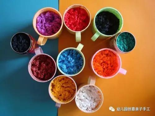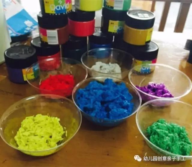 2.接着倒进水粉颜料搅拌,形成有颜色的纸巾,再倒进一些白乳胶,搅拌