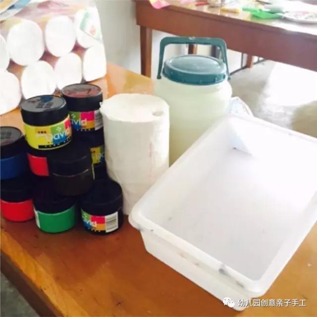 3.然后,分开盘子装纸巾,倒进水粉颜料,待用