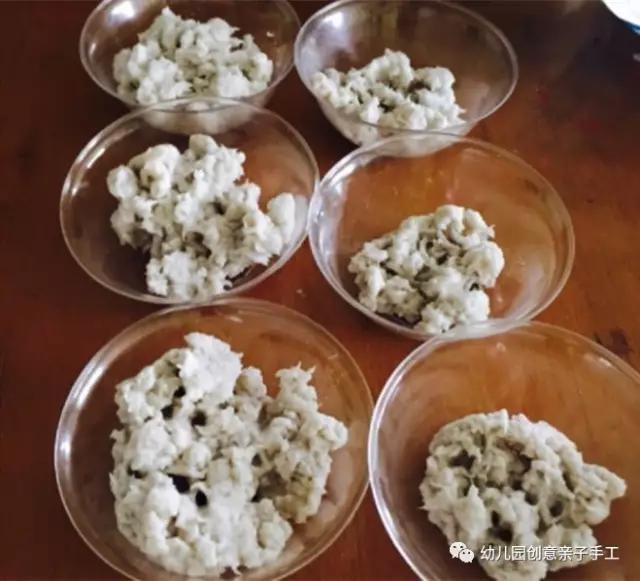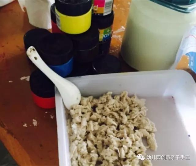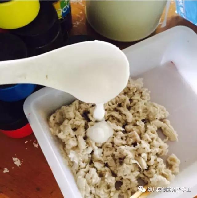 2.接着,搅拌纸巾,等待纸巾吸收水分完全,就倒进一些白乳胶,继续搅拌