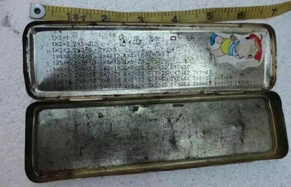 这是小时候同学们普遍用的铅笔盒,铁盒子上画有动画人物,此外在这种铅笔盒上,一定有99乘法口诀。