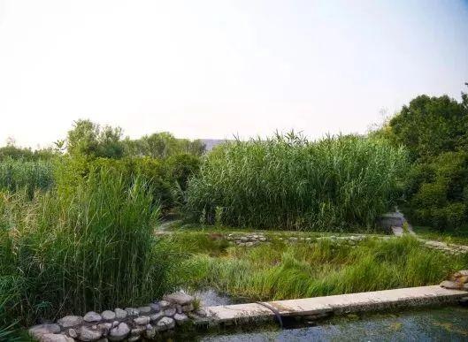 干净并具有曲线弧度美的小路分布期间,路的两侧有芦苇片片荡漾、摇曳多姿,以小型瀑布、花架为衬托,充分让人感受到小桥流水人家的自然风光。荷花盛放,芦苇丛生,紫薇石榴零星的点缀其间,是消夏散步的好地方。