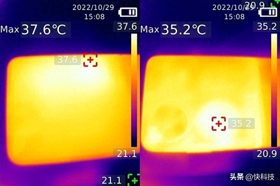 温度方面,机身正面最高温度37.6℃,机身背面最高温度只有35.2摄氏度(室温25℃),表现极佳。