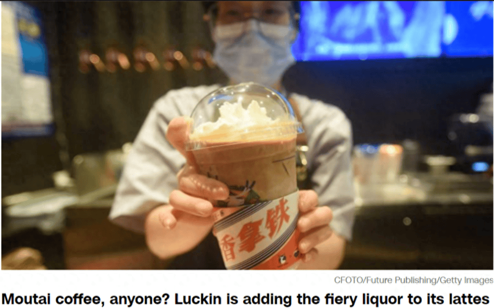 该文章向读者介绍说,这杯咖啡含有中国人喜爱的一种叫“飞天茅台”的白酒,茅台在中国是家喻户晓的品牌,同时也是各种高规格宴请上必不可少的饮品,因为其浓烈的香味被昵称为“火水”(fire water)。