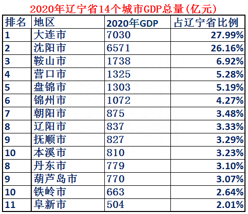 辽宁省共管辖14个市,辽宁经济最强市是大连市经济总量7030亿,占辽宁总体的27.99%,大连地处辽东半岛南端、黄渤海交界处,与山东半岛隔海相望,是重要的港口、贸易、工业、旅游城市。其次是沈阳市经济总量6571亿,占辽宁总体的26.16%,沈阳,辽宁省省会、副省级市、特大城市、沈阳都市圈核心城市,为高能级的国家中心城市之一、先进装备制造业基地和国家历史文化名城。沈阳是中国北部战区司令部驻地、沈阳联勤保障中心驻所,长三角、珠三角、京津冀地区通往关东地区的综合交通枢纽,一带一路向东北亚、东南亚延伸的重要节点。沈阳是东北地区 政治、经济、文化中心和交通枢纽的中心。大连和沈阳经济总量占辽宁省的一半以上。