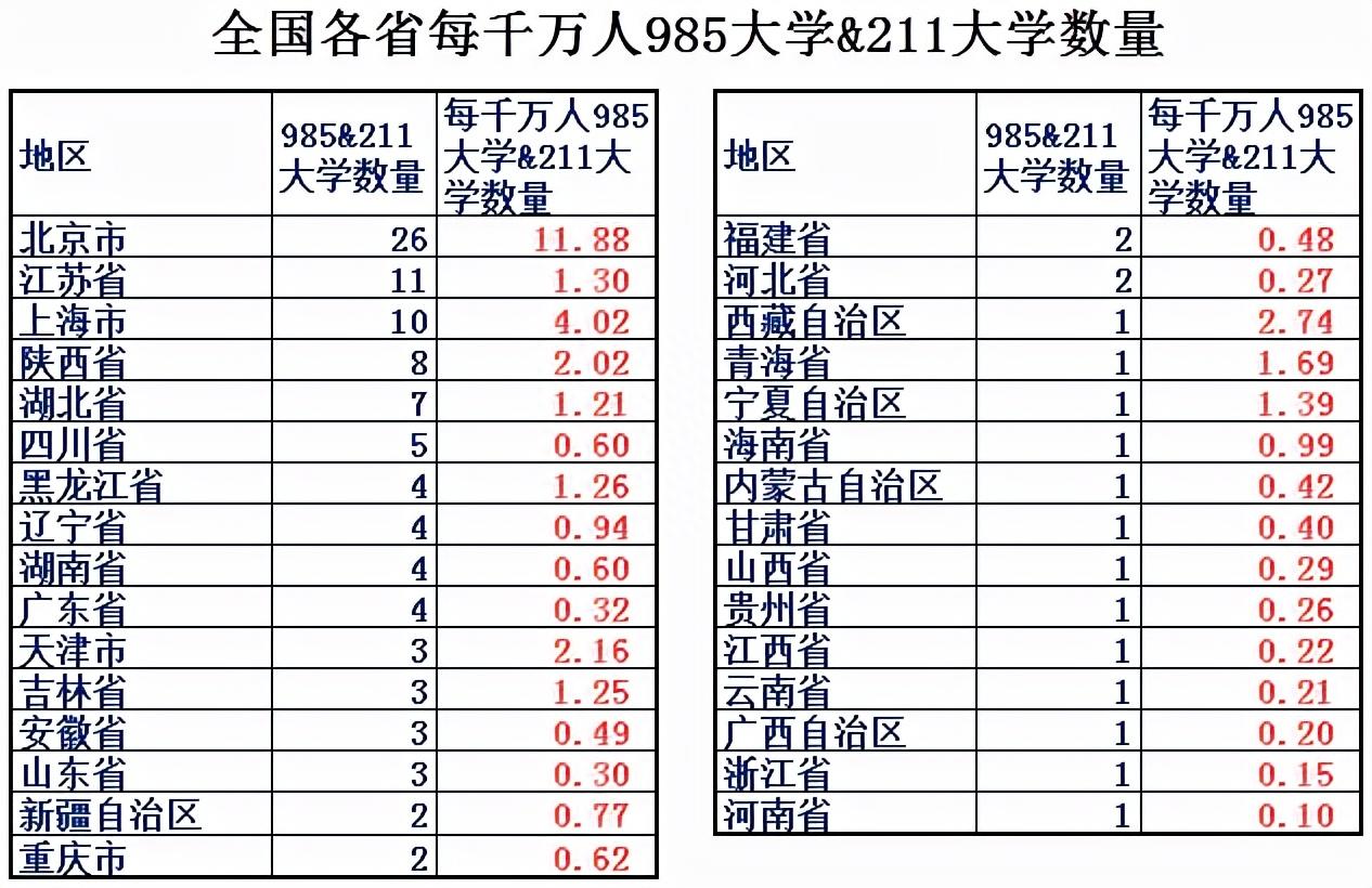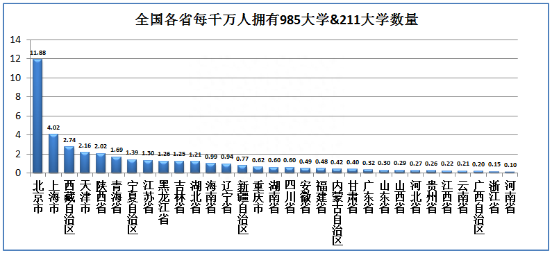 因为各个省份拥有的好大学数量不一样,所以各地考生进入好大学的难度系数不一样,在有些省份真的是难于上青天。因为每个省份的人数不一样,所以不能单纯地用大学数量来对比。为了便于大家清晰地看到各省考生的难易程度,就以中国最顶尖的大学:985大学和211大学,在各地用人口数量来对比,以每千万人985大学&211大学数量来衡量,用大数据来看看各地的难易程度。