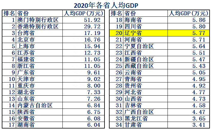 5.辽宁省2020年人均GDP 5.77 万人民币,排名中国第20