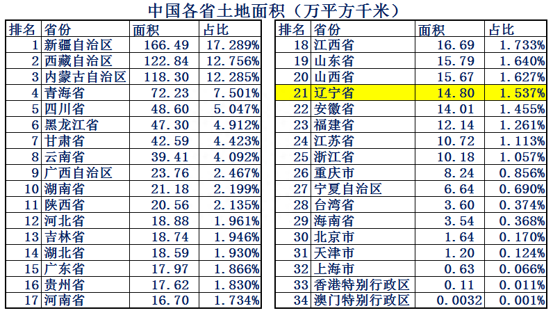 3.辽宁省土地面积14.8万平方公里,全面排名第21,占中国963万平方公里国土面积的1.537%