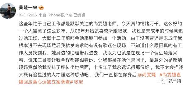 是的吴楚一是尚雯婕粉丝,网传其贴吧ID为“挚爱尚小姐”。(吴楚一说贴吧是盗号的但又说都是盗自己QQ名字和头像,那反正还是爱尚小姐没错。)这几天吴楚一反复说自己原来微博号都丢了,是为了给偶像反黑才找回来的。
