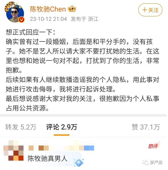 10月12日,陈牧驰迅速承认,称有过一段婚姻,和平分手。热评第一条:陈牧驰真男人。