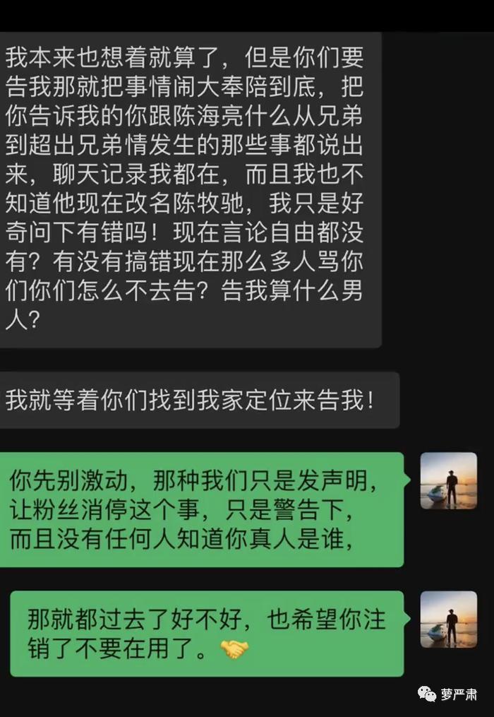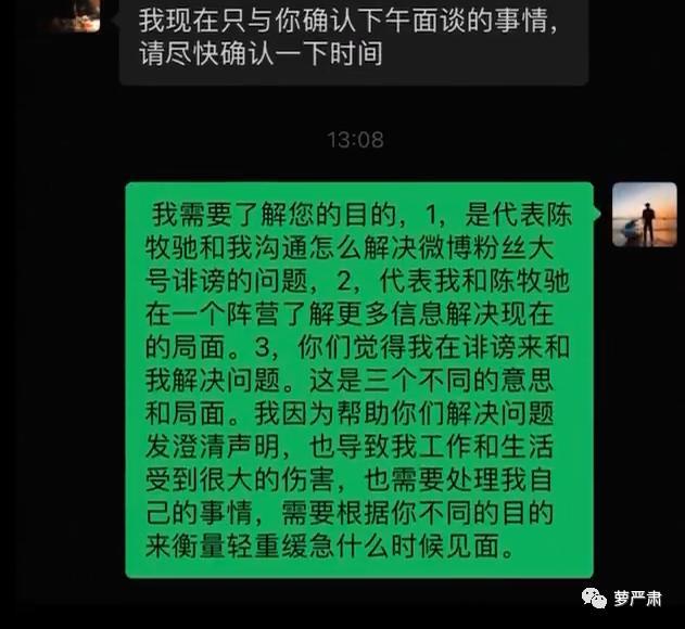 这段对话最能看出吴楚一的纠结点了:我需要陈牧驰和我站在一起、处理陈牧驰粉丝骂我的问题和其他问题;而不是你们出律师来说我诽谤。——“我跟陈牧驰本来应该是一头的啊”这样的意思。