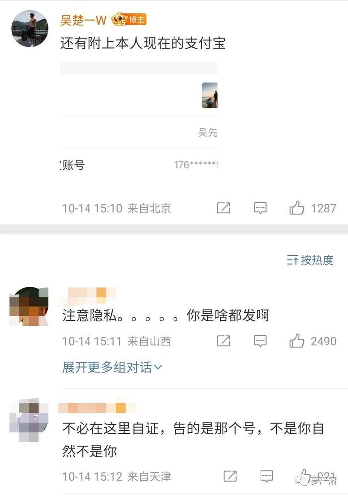 所以吴楚一干脆连自己的支付宝截图都发,以证明网传的人肉过程里的手机号不是自己。