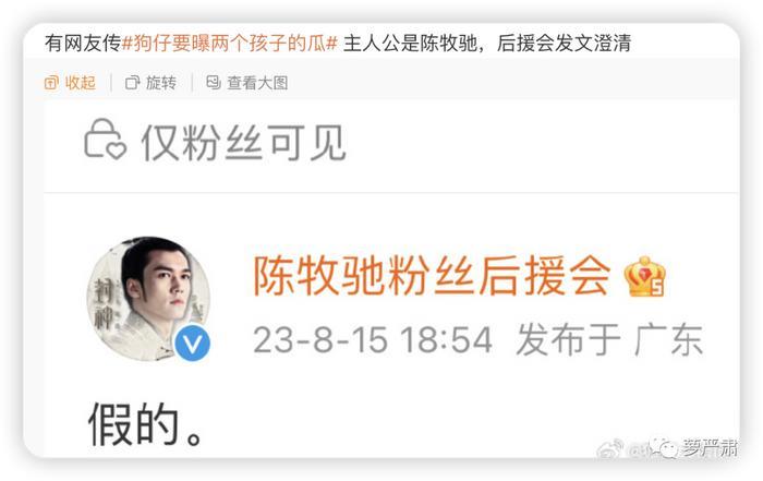 今年8月陈牧驰刚火不久,就有传言说他已婚有娃,陈牧驰后援会澄清是假的。