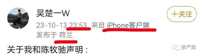 爆料博IP在荷兰,吴楚一发的澄清博IP也在荷兰。手机型号一样这个暂时不纳入证据,用iPhone的太多了。