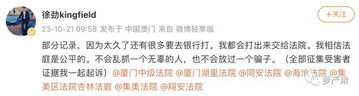 就在昨天上午,徐劲连晒四张给吴楚一打钱的记录。