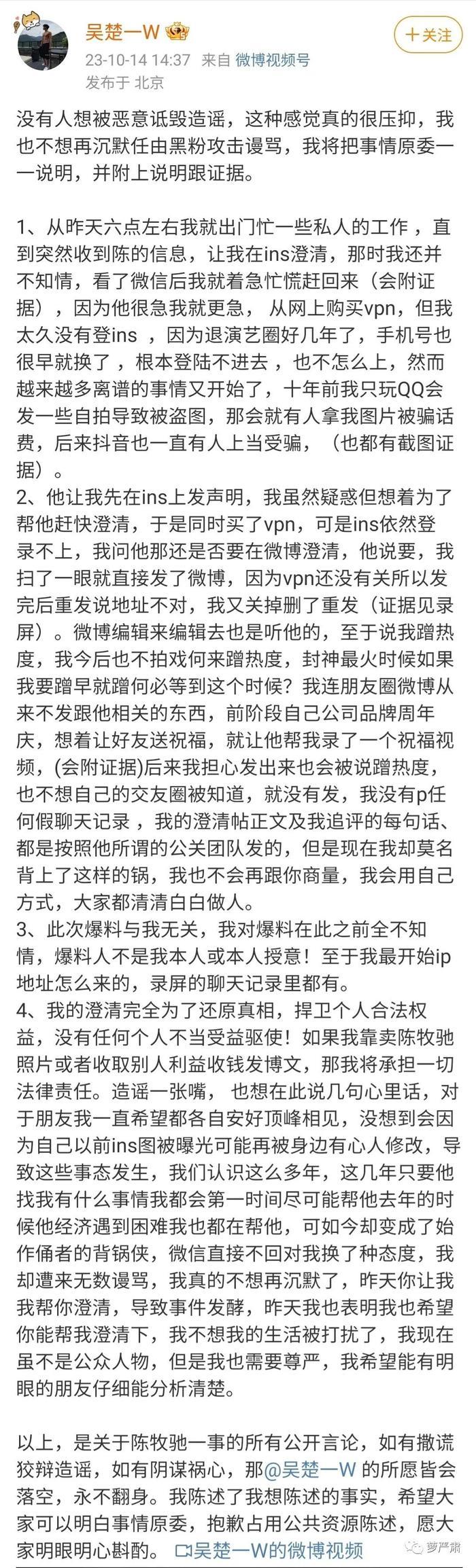 总结一下吴楚一澄清的意思就是:自己也是因为陈牧驰要求才做澄清,着急购买翻墙工具、Instagram账号已废弃多年,自己曾经经常被人盗图;为了尽快澄清想要登IG,登不进去的时候发了澄清微博,所以IP地址在海外;绝对不是自导自演,不是蹭热度,自己身为陈牧驰老友现在从不提他,公司品牌周年都没有用陈牧驰祝福视频等等。