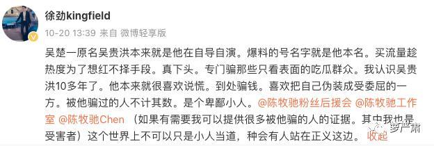 10月20日,微博用户@徐劲kingfield爆料吴楚一本名吴洪贵,称他就是自导自演。