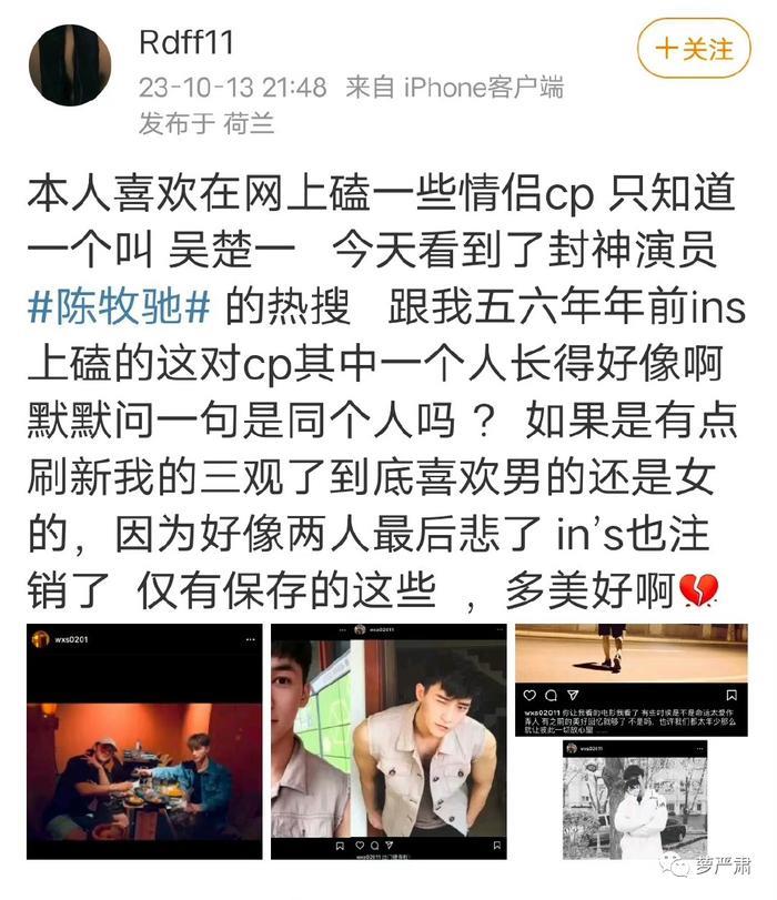 一条发布于荷兰引发千层浪的微博:“本人喜欢在网上嗑一些情侣CP,只知道其中一个叫吴楚一,今天看到封神演员陈牧驰的热搜,默默问一句是同个人吗?“这条微博引发轰动后迅速注销。