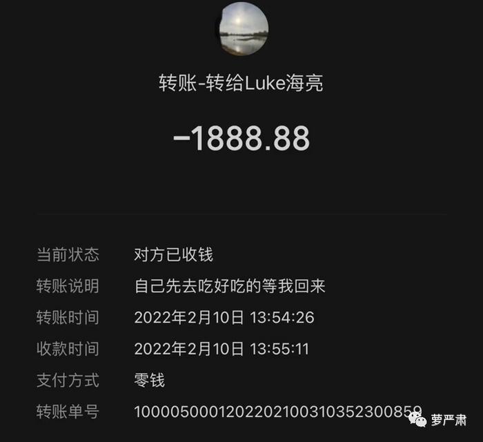 2022年2月10日(又是情人节前夕),吴楚一转账1888并附言:自己先去吃好吃的等我回来。