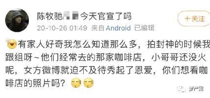 部分封神粉丝才发现早就有个号叫@陈牧驰罗×今天官宣了吗,自称封神拍摄时在跟组,2020年这个号已经笃定陈牧驰有个伴侣,女方在微博小号秀恩爱。由于陈牧驰方坚决辟谣没孩子,结过婚这事儿就略过了。