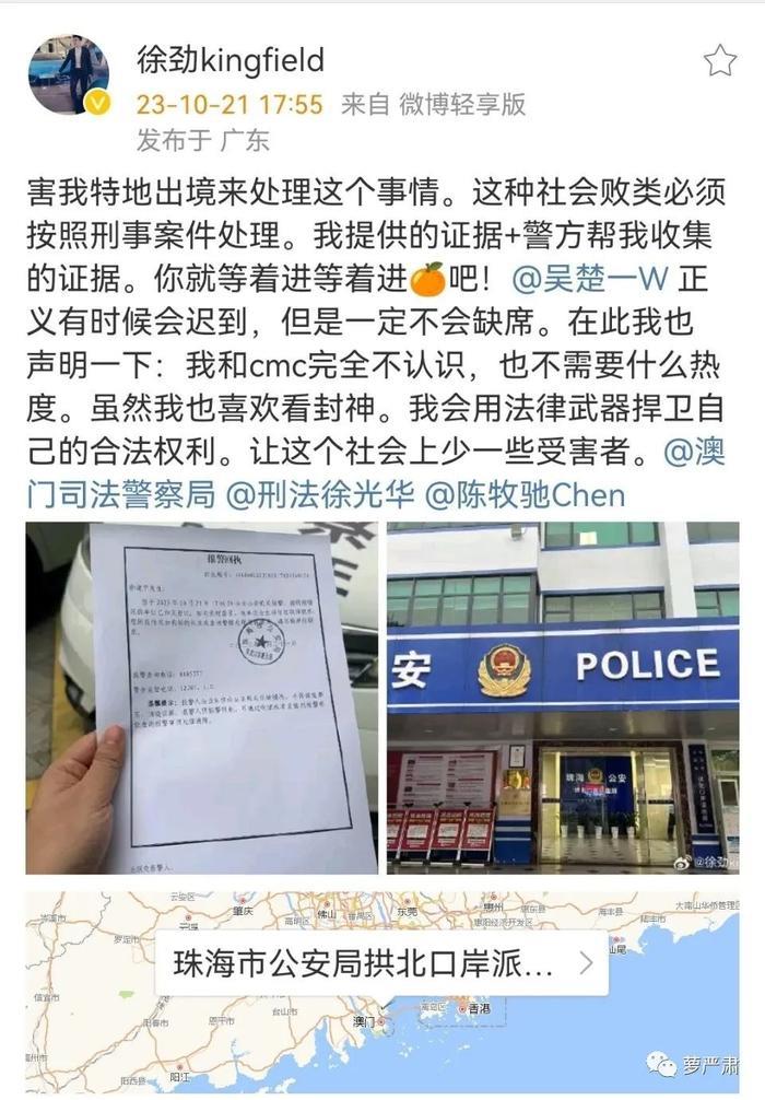 然后徐劲去报案了也去报案了!徐劲现在长居澳门,还是到珠海去报案的。你们这个圈子……吵架就要双双报案吗?(徐劲报案微博已删除,但又说在走法律流程了。目前看来吴楚一态度强硬点。)