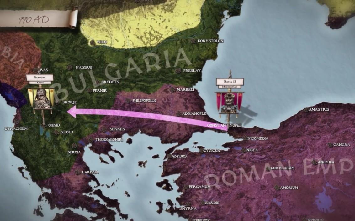 此时拜占庭新皇帝巴西尔二世(962年—1025年在位,976年—1025年亲政)已经亲政,作为马其顿三皇之一的巴西尔二世无法容忍保加利亚的这种“挑衅”行为,决心采取严厉的报复行动!
