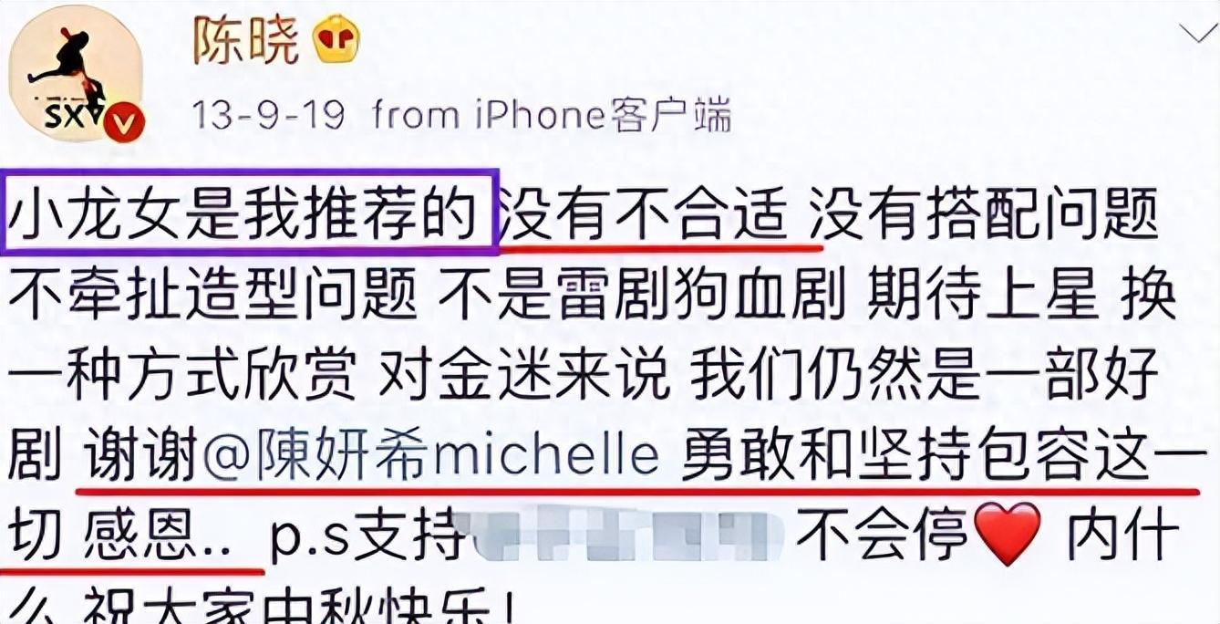 想当初二人也是非常恩爱,就连陈妍希因为“姑姑”造型遭受网友谩骂时,陈晓都是公然回怼道:“她是我的,还说造型也是自己设计的...”,充分保护自己的妻子。