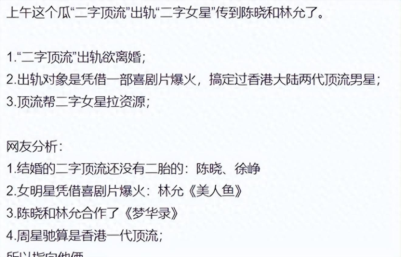 原来有神秘博主,曾爆料:“二字顶流出轨喜剧演员出身明星”,还表示:“男星正在闹离婚,小三曾拿下香港著名导演..”一时间网友都将二人联系到陈晓与林允身上。