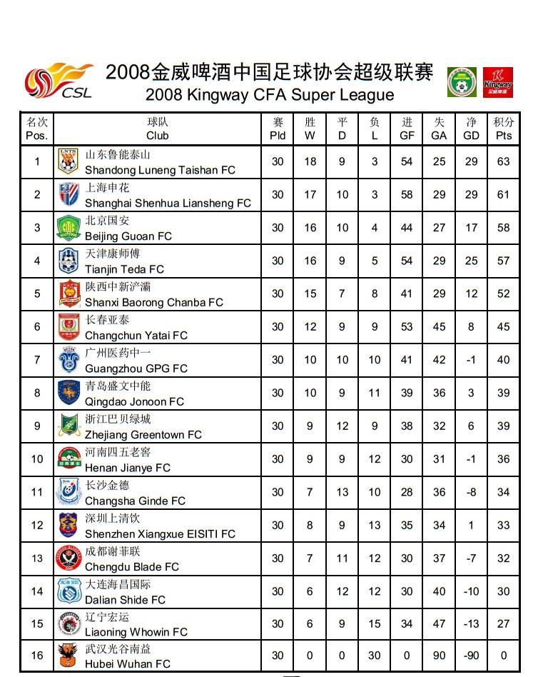 2008赛季由于武汉光谷队的中途退出,实际只有15支球队参赛。该年也实行了“升二降一”的升降级制度。联赛于2008年3月29日展开,于11月30日结束,本届赛一共有16队(实际只有15队)参与。由于2009年亚洲冠军联赛赛制改革,2008年中超联赛的前4名将进入2009年亚冠联赛分组赛,而不是往年的前2名。最终,山东鲁能泰山以2分之微,力压上海申花第2次夺得中超锦标,两队联同季军的北京国安及殿军的天津泰达参加2009年亚洲冠军联赛。08、09这两年,金威啤酒品牌冠名中超联赛。由于对方资金欠缺,所以最后联赛分红一部分不得不以啤酒凑数。