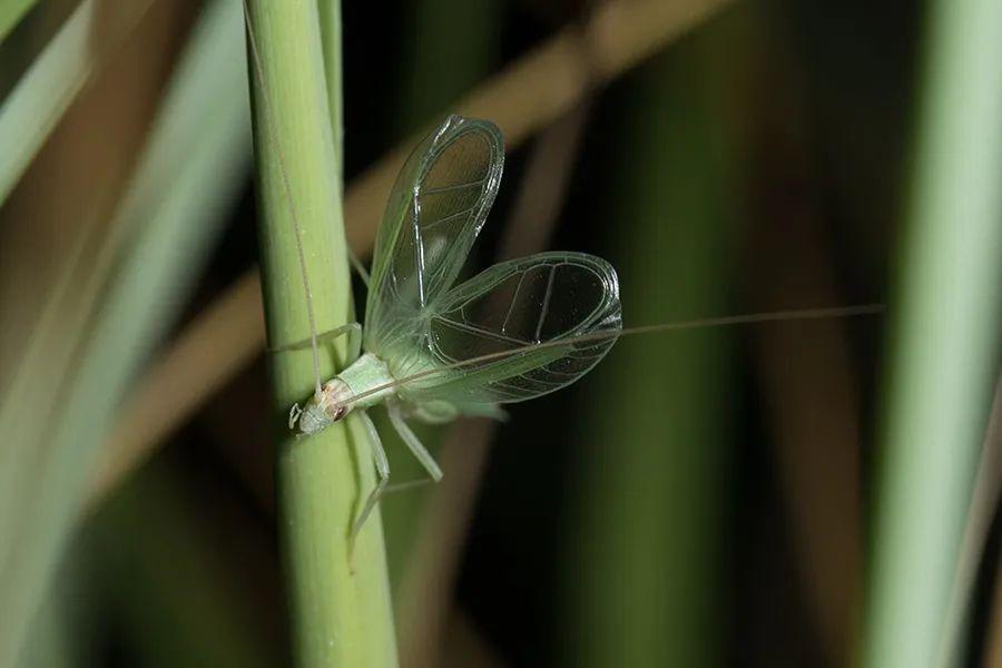 俗名紫竹蛉。体型比青竹蛉稍大,腹部有一条紫黑色的线(图7.2隐约可见),体色多有变化,淡绿、黄白或带褐色。鸣声急促连续,频率快,音调低,类似芙蓉鸟叫声和木鱼之声(什么手速啊,敲木鱼这么快)。