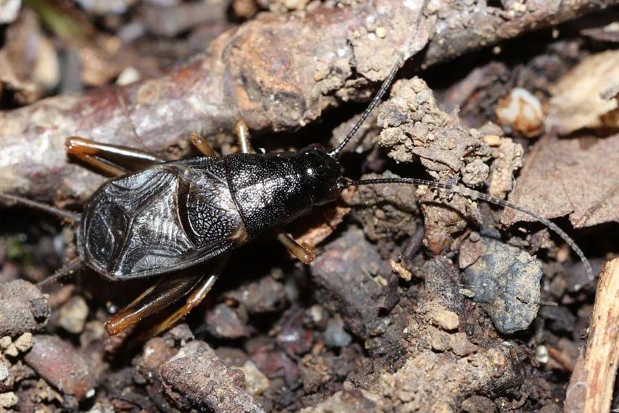 还是墨蛉。体型比前述2种墨蛉更小一些,后足股节基部2/5为淡黄色,端部3/5为暗黑色,犹如女生穿了黑丝一般,很容易辨认。常少量混在黑头墨蛉蟋中出售,特称乌节墨。
