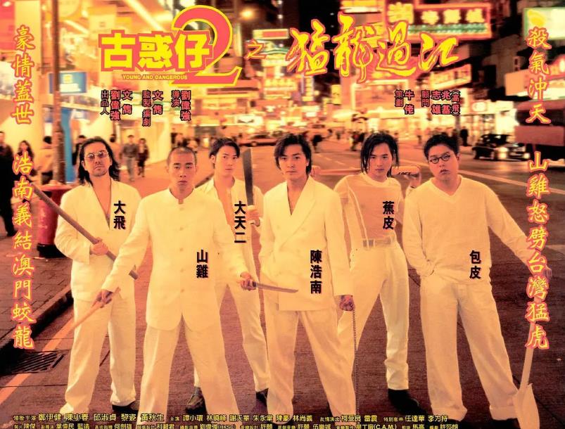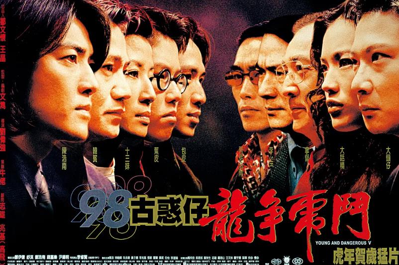 1996-2000年,根据《古惑仔》漫画改编的古惑仔系列电影一共十部,其中以陈浩南、山鸡等人为主角,演绎陈浩南“发家史”的古惑仔“正传”包括《古惑仔之人在江湖》(1996)、《古惑仔2之猛龙过江》(1996)、《古惑仔3之只手遮天》(1996)、《97古惑仔之战无不胜》(1997)、《98古惑仔之龙争虎斗》(1998)、《古惑仔之胜者为王》(2000)六部。六部影片由文隽编剧、刘伟强导演,在内容上彼此延续,讲述陈浩南从古惑仔上位至铜锣湾堂主,直至成为洪兴社团接班人的故事。由六部正传衍生出来的古惑仔“外传”有《古惑仔情义篇之洪兴十三妹》(1998)、《古惑仔激情篇之洪兴大飞哥》(1999)两部,讲述的是古惑仔“正传”中两个配角十三妹与大飞的故事;《新古惑仔之少年激斗篇》(1998)作为古惑仔电影的“前传”,讲述陈浩南与山鸡等人少年时代的故事;《古惑仔友情岁月之山鸡故事》(2000)内容上讲属于古惑仔电影的“别传”,前半段讲述山鸡少年时代与邻家女相恋的故事,后半段重又回到江湖厮杀的套路中来。其它以古惑仔为题材仿拍跟风之作,除《洪兴仔之江湖大风暴》(1996)、《古惑女之决战江湖》(1996)等少数几部具有一定水准之外,其余大都粗制滥造。
