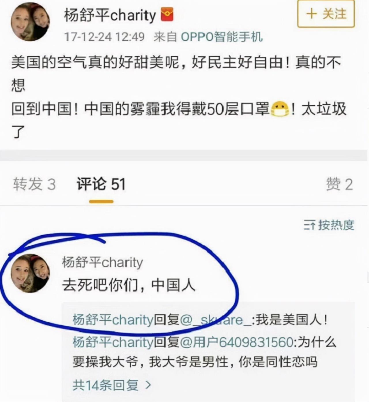 “她(杨舒平)只是一个极端利己主义而已,在美国说美国空气好,要是在其他国家,也会献媚地说其他国家的好。”