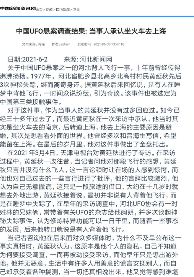 直到2021年,河北省UFO研究会所的研究员针对黄延秋事件写了一篇名为《外星人带我去旅游》地文章。那些尘封已久的往事再次被揭开,当地研究UFO的研究人员带着疑虑亲自到黄延秋的家里登门拜访。