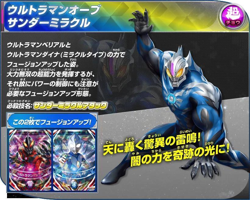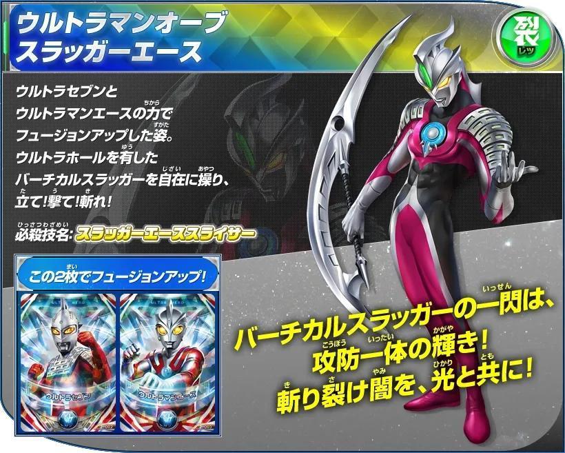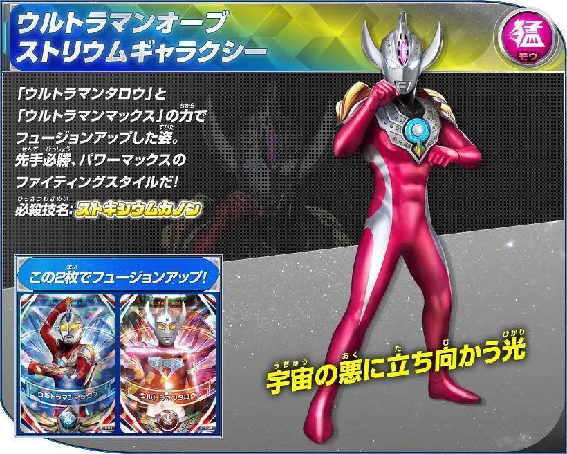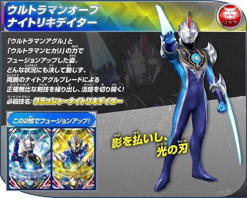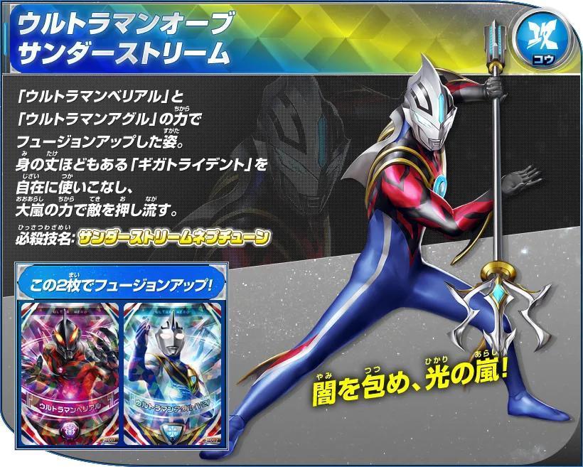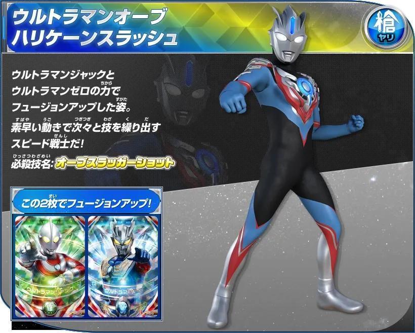 杰克奥特曼&赛罗奥特曼的卡片双重读取后Fusion Up的姿态。擅长格斗战,所施展的手刀和踢技均带有强烈的切割效果,作战迅速,攻势迅猛,可以瞬间移动,并且擅长于使用武器作战,用三叉戟型的武器“欧布头镖长枪”来战斗!