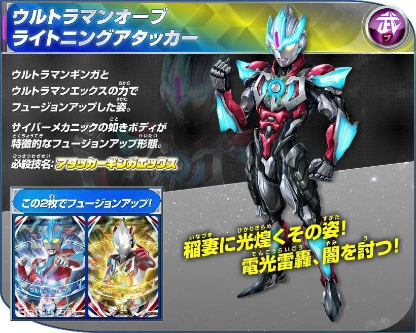 用银河奥特曼与艾克斯奥特曼的力量融合升级的姿态。以如同电子机械一般的身体为特征的融合升级形态。在闪电中闪耀光辉的身姿!