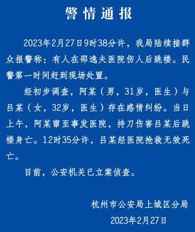 又是出轨惹的祸?杭州邵逸夫医院男医生情杀浙大女博士,称相恋12年