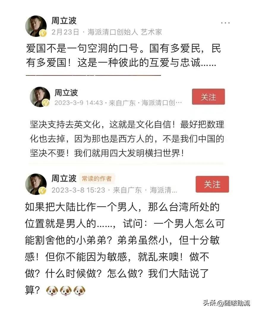 翻看周立波最近那些言论,有种站在“巨人”肩上看“傻子”的感觉,好像自己是全世界唯一的明白人一样,再就是立场不明确,自己移居美国,做了这么多错事,还想教育别人,有一种被西化的感觉。