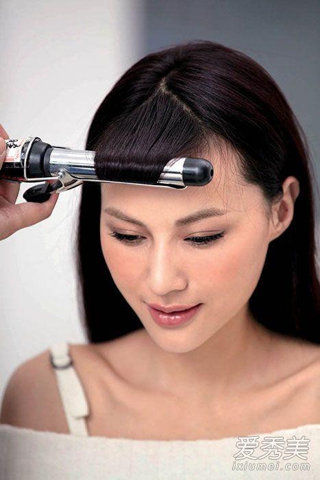在打造八字刘海前,可用卷发棒将整体刘海从发根开始卷曲,只要微微卷出自然弧度即可。