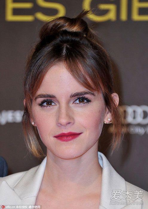 丸子头X八字刘海让一贯走知性范儿的艾玛看起来俏皮可爱了许多。