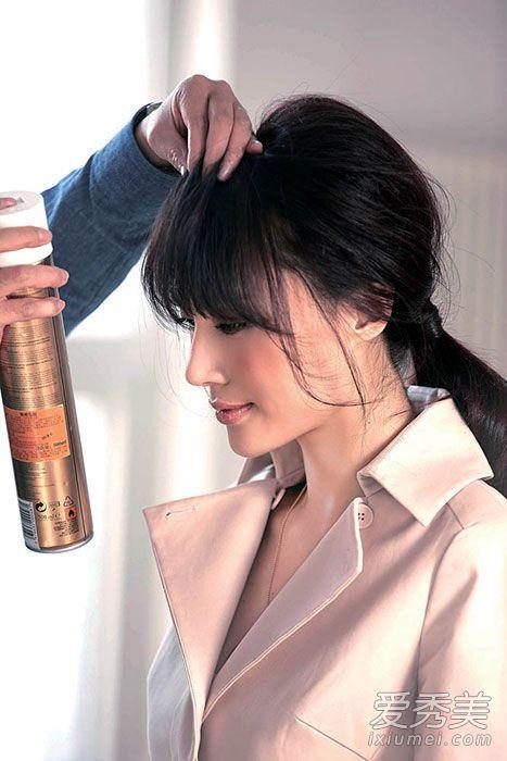 在将八字刘海拨弄完成后,为了保持刘海自然的蓬松感,最后可用喷雾定型