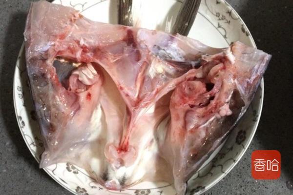 2.剖开后的鱼头清洗干净,去除鱼鳃,还有里面的黑膜。沥干水分备用。