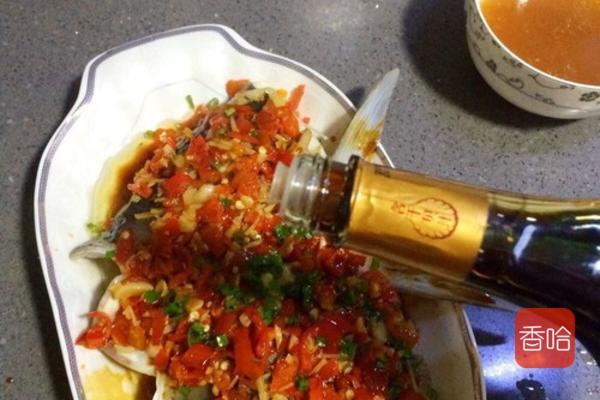 13.鱼头撒上葱花,把热油淋在鱼头上面。