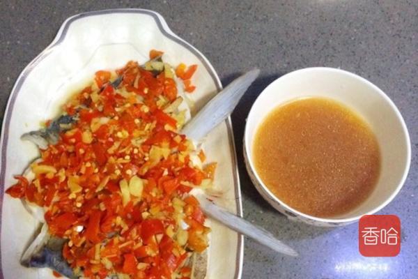 8.蒜放好后,在鱼头表面均匀的铺满剁辣椒。